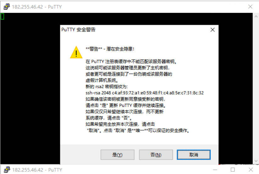 点击“Open”后,会弹出一个黑色终端窗口,第一次连接时通常会提示“安全警告”,问你是否信任这个主机的密钥。