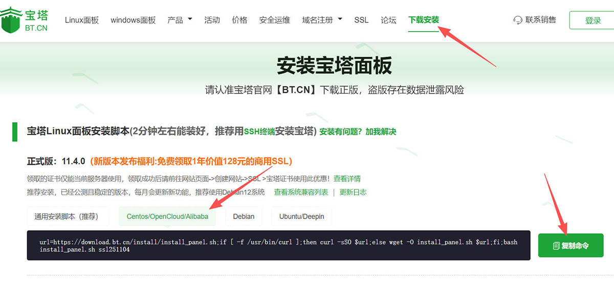 第二步,打开宝塔网站后,按照下面图示,选择下载文件地址,点击复制命令。