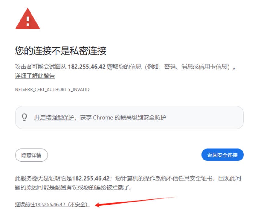 拿到这些登录信息后,接下来就要打开浏览器,在浏览器中录入即刚刚外网ipv4的面板地址,类似:https://182..255.46.42:29718/d7c72f7c,。不用紧张,第一次打开99%都会出现如下页面: