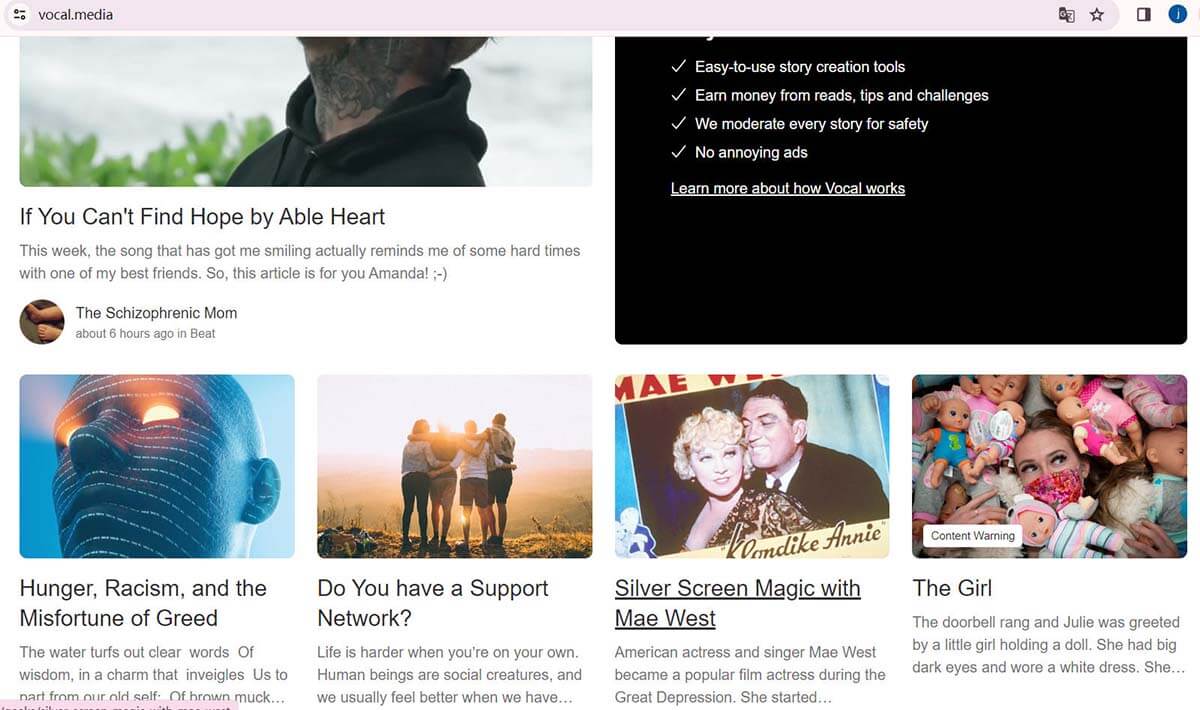 Vocal Media更有趣:它按阅读量+点赞数+粉丝互动综合计算收益,优质内容还有机会被推到首页。它的主题非常宽泛,从个人成长到科技评测都能写。我推荐有个学员,写过“How I Built My First Blog with Zero Coding Skills”,一周内获得了300多次阅读和12美元奖励。关键是,它不要求你有媒体经验,只要内容真实、有共鸣就行。