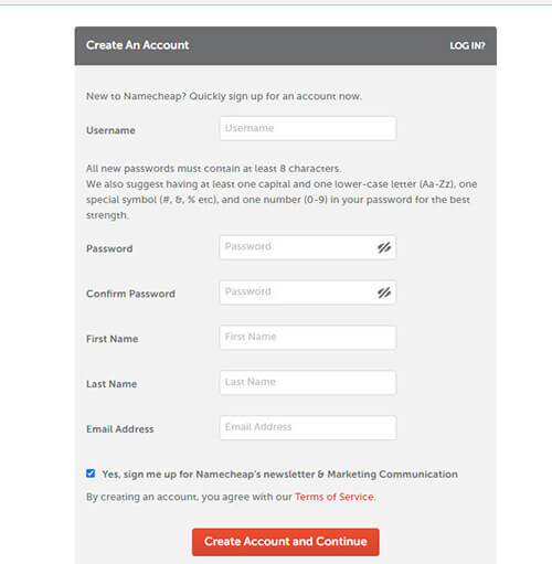 设置密码时,Namecheap会提示你密码强度,我建议你用密码管理器生成一个强密码,毕竟这关系到你所有域名的安全。注册时可能还会让你填些个人信息,像是名字、地址、电话这些,这些信息默认是会受到免费Whois隐私保护的,所以不必太担心隐私泄露问题。