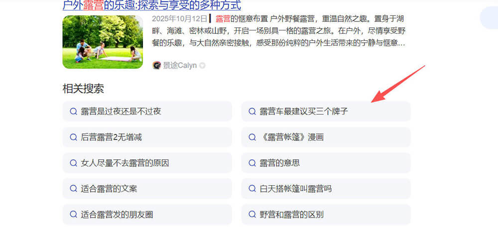 再看搜索结果页的最下面,有个“相关搜索”区域。那里又是一批宝藏。比如你搜“露营帐篷推荐”,下面可能显示“露营帐篷什么牌子好”、“露营帐篷单人还是双人”、“露营帐篷防水指数多少够用”。这些词特别有价值,因为它们是真实用户搜完一个词之后,还会继续搜的关联问题。